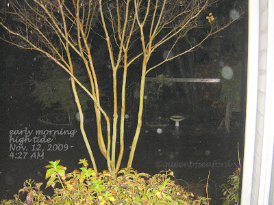 This is the window from which I most often look. If you notice there is a lot of water. We have been playing with what we are calling Nor'Ida. Take one serious nor'easter and add a healthy dose of the remains of a late season hurricane.....include over 10 inches of rain over three days and six tidal cycles. I was going to call this posting 'Where in the Hell is Pat Robertson?' He claimed to pray away hurricanes. Sorry, my sense of humor is shot. High tides got progressively higher with each cycle as the high winds would not allow the waters to recede during low tide. Les from A Tidewater Gardener mentioned flooding in his posting on Thursday.